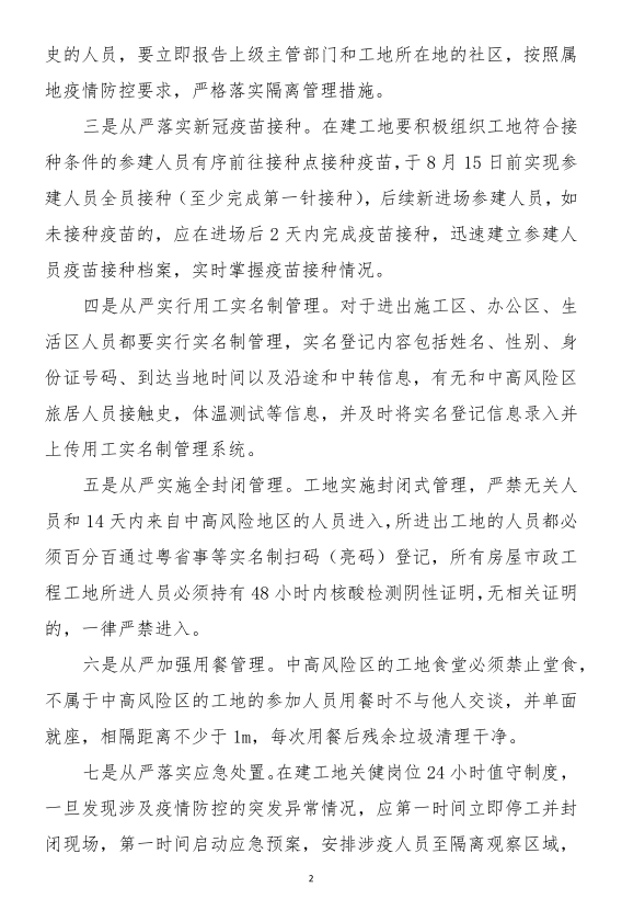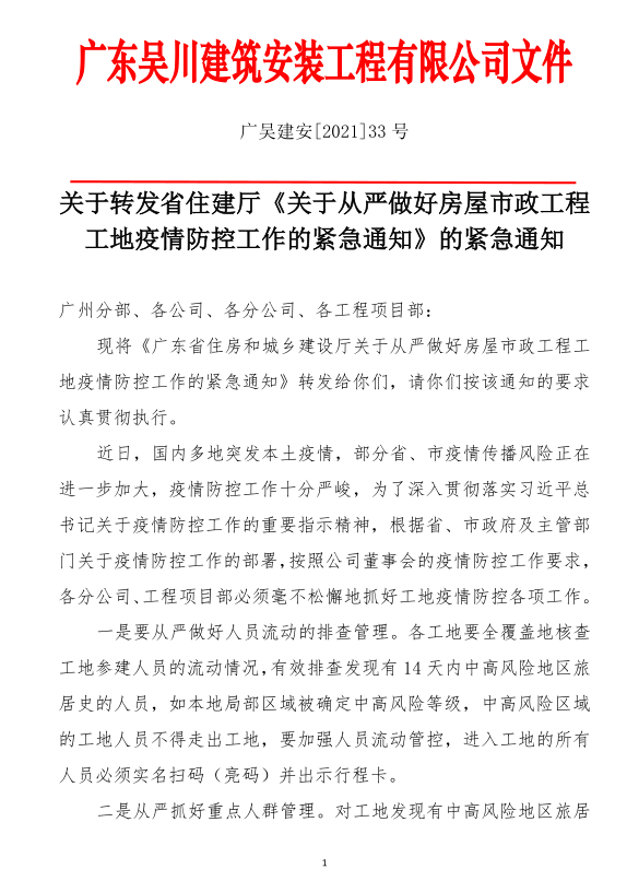 近期,國(guó)內(nèi)多地突發(fā)本土疫情,江蘇宿遷、湖北武漢等地建筑工地已出現(xiàn)新冠肺炎確診病例,疫情在工地傳播的風(fēng)險(xiǎn)進(jìn)一步加大。為深入貫徹落實(shí)習(xí)近平總書(shū)記關(guān)于疫情防控工作的重要指示精神,根據(jù)省委、省政府關(guān)于疫情防控的工作部署,按照全省疫情防控和安全生產(chǎn)電視電話(huà)會(huì)議要求,我廳決定在認(rèn)真執(zhí)行2020年2月印發(fā)的《廣東省房屋市政工程工地防控新冠肺炎疫情工作指引》的基礎(chǔ)上,對(duì)部分常態(tài)化疫情防控措施進(jìn)行提檔升級(jí),提出了以下9方面要求。請(qǐng)結(jié)合本地區(qū)工作實(shí)際認(rèn)真貫徹落實(shí),毫不松懈地抓好房屋市政工程工地疫情防控各項(xiàng)工作。