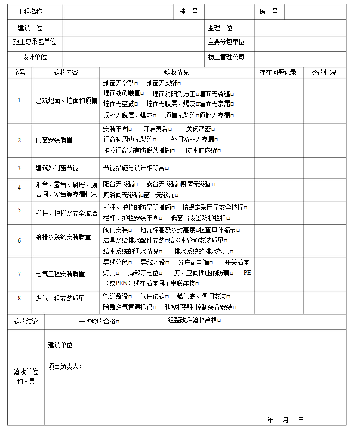 住宅工程分戶驗(yàn)收觀感質(zhì)量檢查驗(yàn)收表
